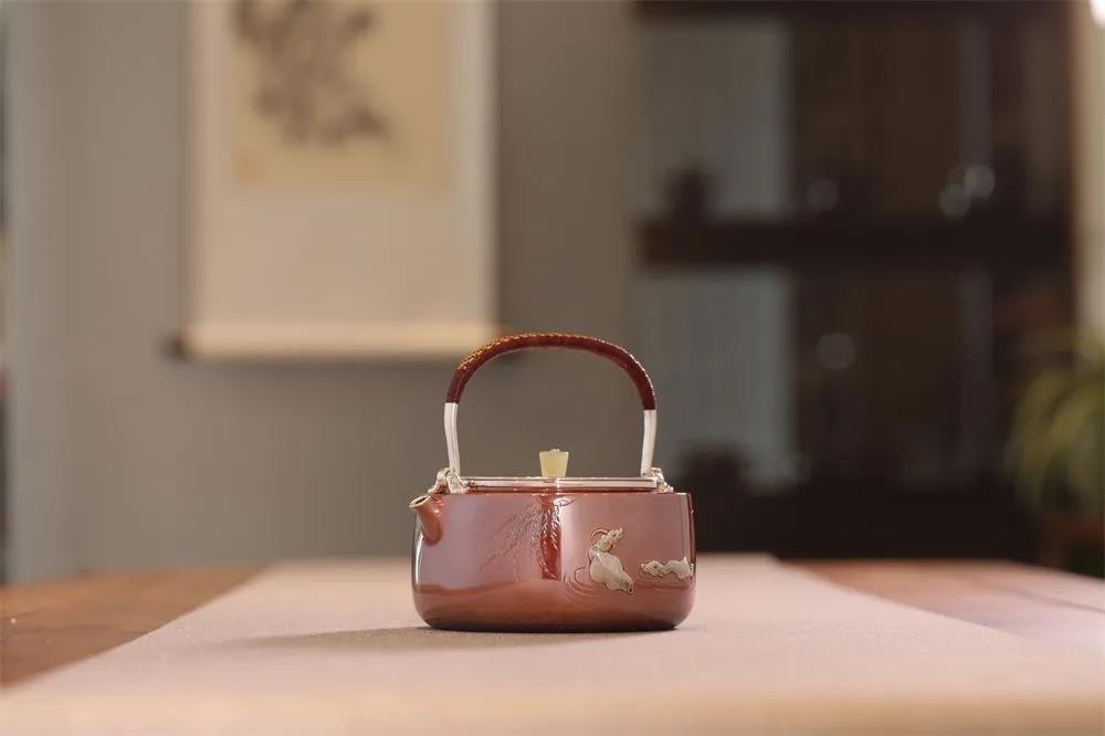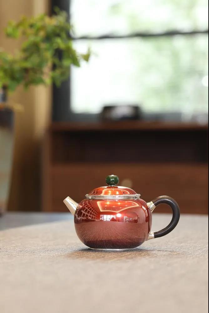 刻牛壺運(yùn)用銅包銀和金銀錯技法。純銅自帶紅橙色金屬光澤,純銀無味,可凈化、軟化水質(zhì),泡茶可以提香,提升茶湯的品質(zhì)!