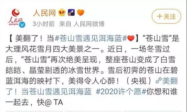 人民網(wǎng)的微博也讀懂了這一點(diǎn),它說:“2020許個(gè)愿,當(dāng)蒼山雪遇上洱海藍(lán),你最想和誰一起去!”