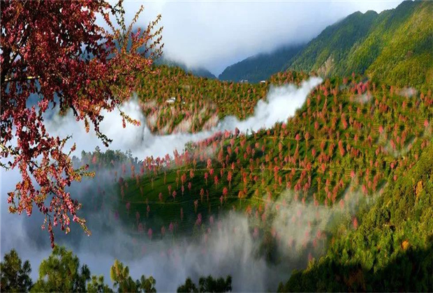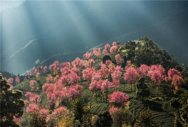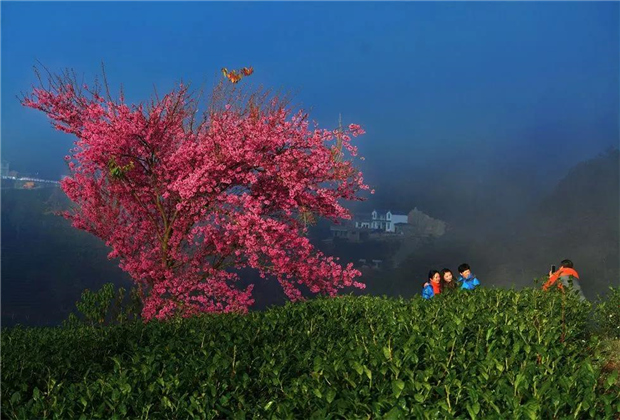 而這山也是極襯這花的。無(wú)量山雄奇又不失溫潤(rùn)秀麗,絲絲縷縷的霧氣不時(shí)自山麓間飄來(lái),綿延的茶樹(shù)在冬日依舊綠意盎然。千山一碧、云飄霧繞,無(wú)量山宛若一塊巨大的臺(tái)幕,盡心襯托著冬櫻的光芒四射。