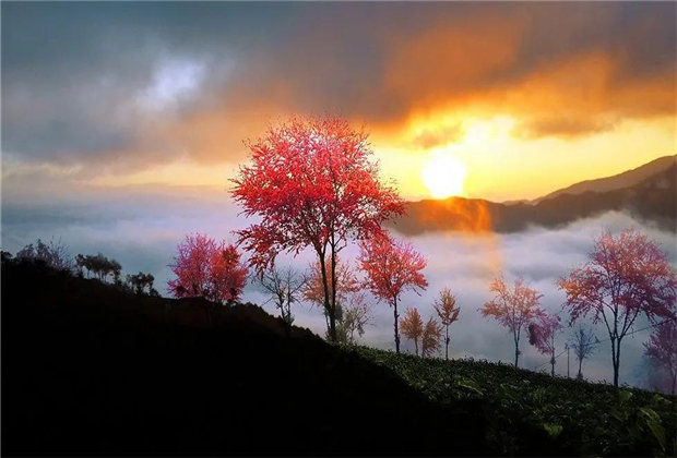 正值呵氣成霜的季節(jié),其它地方早已葉落歸根,滿目枯藤,可無(wú)量山櫻花谷中的冬櫻卻無(wú)視料峭寒風(fēng),開(kāi)了個(gè)滿山櫻紅,遙遙望去,仿若霞光從天垂落,熠熠生輝。