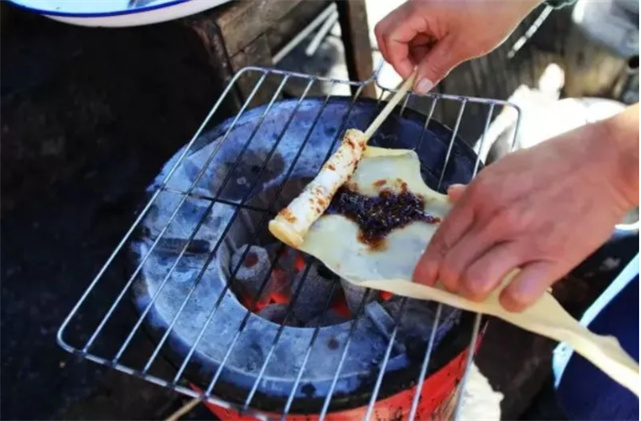 烤的過程中將乳扇平鋪成塊狀,用木棍掛住被烤軟的部分,依口味涂上煉乳或者玫瑰醬,邊卷邊烤,最后卷成筒狀??竞玫娜樯瘸脽嵋弦豢?,口感像軟軟的芝士,稍冷卻后的烤乳扇嚼起來多了幾分韌勁,奶的清香與玫瑰醬的清甜在舌尖上碰撞,耐人尋味。