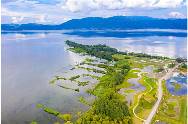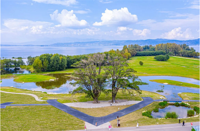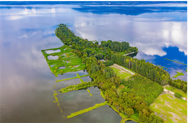 從喜洲出發(fā),穿過蜿蜒的村道,10分鐘車程就可以到達洱海邊,在這里有個因形似舌頭而得名的濕地公園。