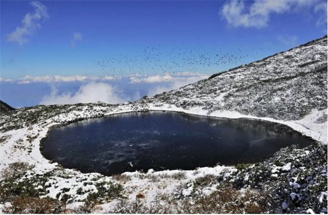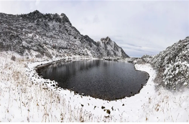 冬日的洗馬潭被雪花這個調(diào)皮的“小孩”把潭邊圍了個遍撒著歡兒地唱著冬天的歌謠。