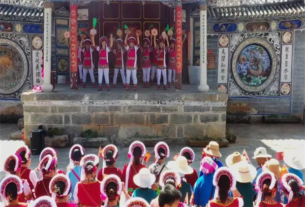 現(xiàn)在這個戲臺仍然在使用,美麗的白族金花們在戲臺上伴著大本曲跳著舞。戲臺不遠處,有一棵百年樹齡的大榕樹,