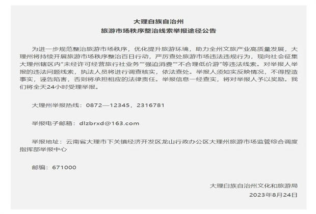 為進(jìn)一步規(guī)范整治旅游市場(chǎng)秩序,優(yōu)化提升旅游環(huán)境,助力全州文旅產(chǎn)業(yè)高質(zhì)量發(fā)展。8月24日,大理白族自治州文化和旅游局發(fā)布大理白族自治州旅游市場(chǎng)秩序整治線索舉報(bào)途徑公告。對(duì)舉報(bào)人舉報(bào)的違法問(wèn)題線索,執(zhí)法人員將進(jìn)行調(diào)查核實(shí),依法查處。