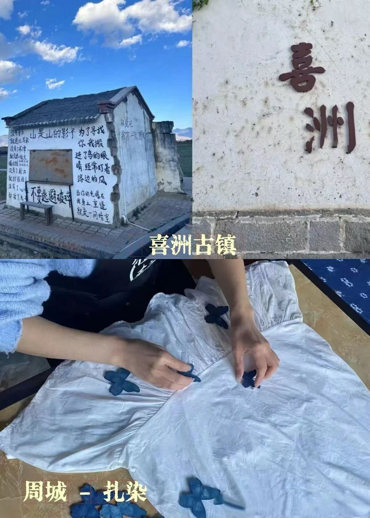 下午:喜歡騎行的可騎車去喜洲古鎮(zhèn),但有一定距離,也可自駕去喜洲古鎮(zhèn)。(?附近的打卡點(diǎn)夫妻樹看點(diǎn)一般,沒時(shí)間的可不去)。有時(shí)間可以前往周城扎染村,體驗(yàn)白族扎染文化。