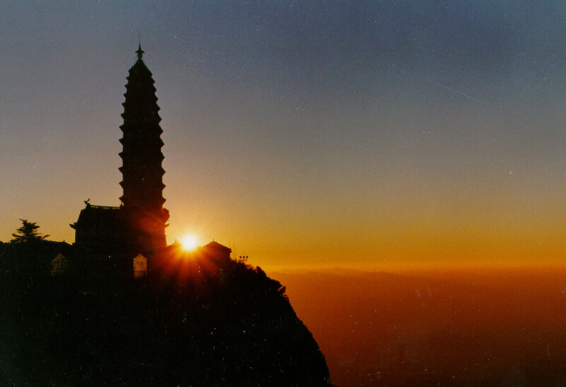 金頂寺。后來(lái)多數(shù)寺宇被毀,現(xiàn)僅存清代的祝圣寺、金頂寺大門(mén)和楞嚴(yán)塔。山間云霧縹緲,溪水琮琮,為中國(guó)佛教名山之一。
