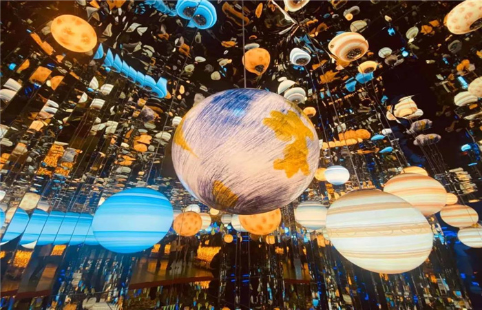 其中的流浪地球燈,近距離的感受不一樣的宇宙星空,當(dāng)你靠近燈盞時繽紛的色彩遂不及防地涌向你的雙眼,360度的鏡像、空靈的音樂氛圍、讓你如同身處迷離的幻境星空!