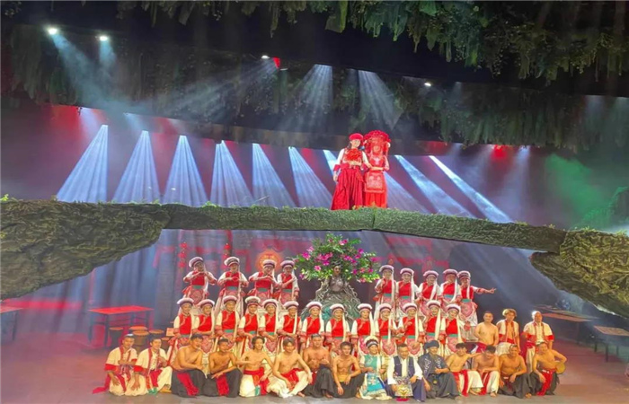 《阿鵬找金花》是楊麗萍總編導(dǎo)的第十部大型舞臺劇,圍繞大理白族文化而創(chuàng)作,具有濃郁的少數(shù)民族風(fēng)情。整個劇目講述了白族年輕男女的愛恨糾葛中,白族青年男女之間質(zhì)樸純真的愛情和白族勞動人民的勤勞智慧被淋漓盡致地呈現(xiàn)在舞臺上。