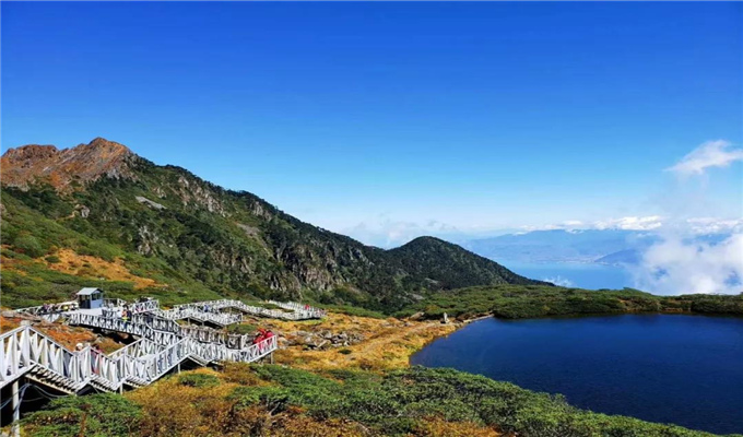 只有洗馬潭附近還盛放著零星的野花,天朗氣清,秋日爽朗就是這幅景象,沒有云霧遮擋的洱海就這么直接出現(xiàn)在眼前,湛藍(lán)的洱海與藍(lán)天互相輝映,秋意就這么在山巔流轉(zhuǎn),明媚的秋天,山峰都披著絢麗的色彩。