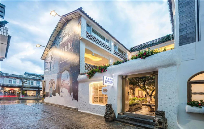 沿著大理古城玉洱路款款前行,在一片青瓦白墻、錯(cuò)落有致的白族建筑群中,一座小“圣托里尼”——風(fēng)雪故城藝術(shù)花園客棧脫穎而出。