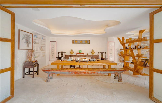茶室內(nèi),只見左邊墻壁的鏤空洞穴里擺放著許多古玩茶具;靠窗的茶桌旁,布置一個(gè)大大的壁爐,風(fēng)雪交加之際,當(dāng)壁爐內(nèi)燃起炭火,溫暖從腳邊升騰,直抵心尖。