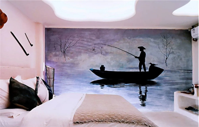 名為“漁歌唱晚”的房間內(nèi),一幅大大的洱海打漁壁畫上,漁夫正在垂釣。草帽、漁網(wǎng)、魚簍隨處可見,行走其間,洱海邊世世代代打漁人的打漁時(shí)光漸漸浮現(xiàn)。