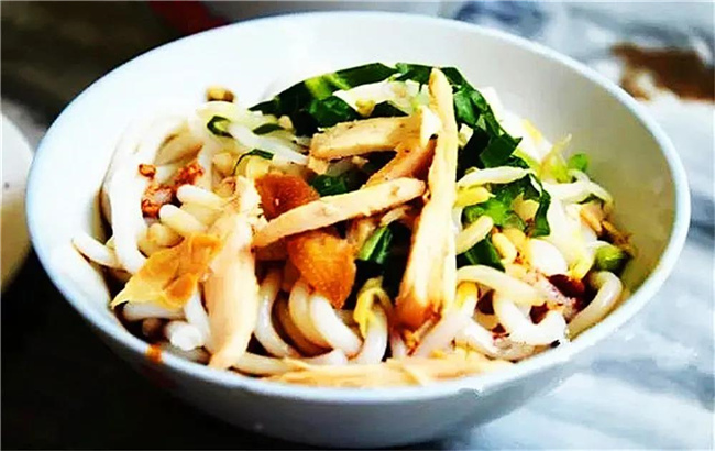 精制的涼雞肉絲靜臥于綿軟潤白的米線之上,每吸溜一口再回首的涼雞米線,都筋道十足,細(xì)滑爽口。