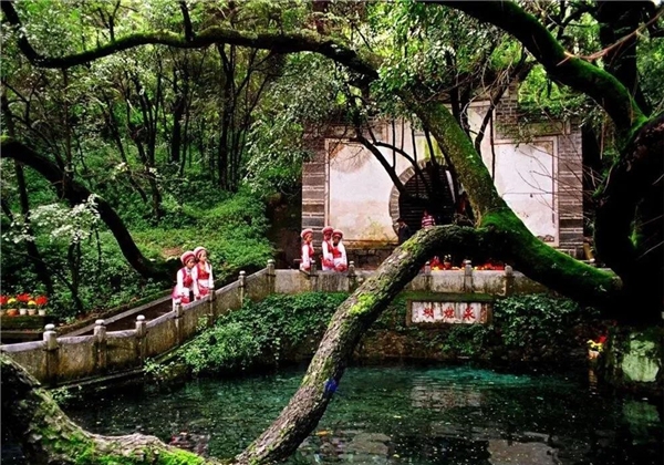 從泉底冒出,橫臥泉上的高大古樹(shù)便是合歡樹(shù)。合歡樹(shù)遒勁有力的樹(shù)干伏于泉水之上,似與泉水共纏綿。每年夏天,樹(shù)上淡黃色的花朵成片開(kāi)放,遠(yuǎn)遠(yuǎn)望去,就像盤(pán)旋在枝頭的蝴蝶,蝶花相映,神秘動(dòng)人。