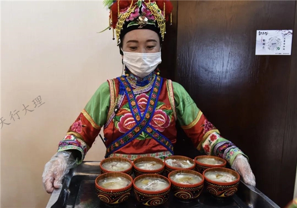 此湯用土雞、老臘肉等細(xì)心燉制,取名為“福祿南詔”,湯盅選用葫蘆造型,乃“福祿”諧音。