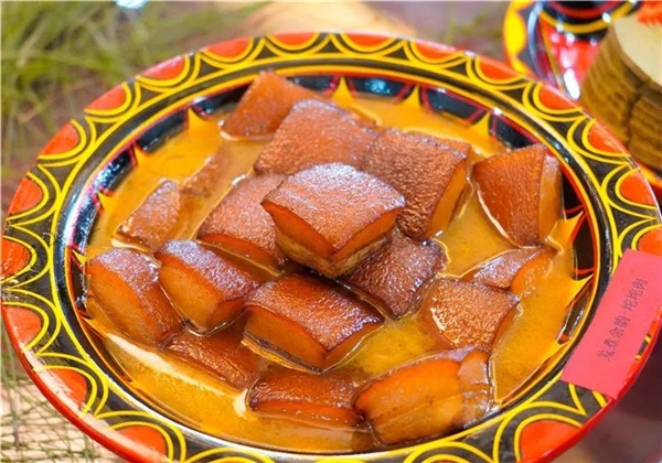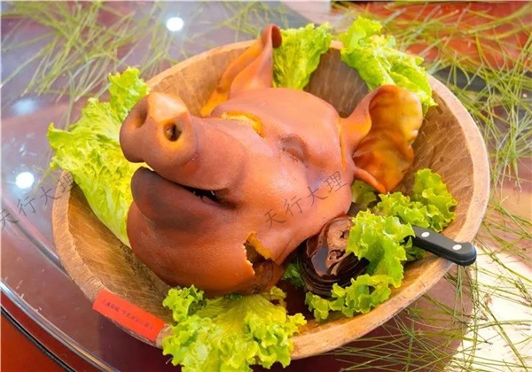 豬和雞為彝族必須的祭祀用品,是彝族最早馴化的動物之一。豬頭肉皮厚而富膠質(zhì),肉少而嫩,耳骨脆而可食。“扒香豬頭”彝語“嗬蜜哈”,系南詔宮廷美食,成菜色澤紅潤,香糯濃醇,咸甜適度。