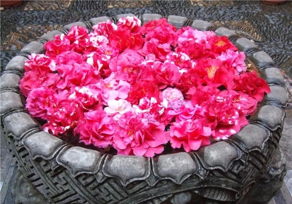 還有飄在水中的茶花,仿佛水也是紅的,一盆盆一缸缸艷美,不像在腳下,倒像在心底,看久了心事都會(huì)看化。按張家花園的傳統(tǒng),飄過三天,那些茶花就會(huì)變成花肥,綻放在次年春天枝頭,而這一季的盛放中,仍有上一年的落紅藏底,如此落落開開,年復(fù)一年。