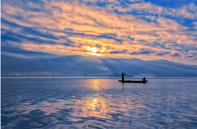 “水色清澄,漁帆點(diǎn)點(diǎn),菰蒲掩映,頗似杭州西湖,為邊地勝景?!?劍湖形似“大元寶”,堪稱鑲嵌于滇西北高原上的璀璨明珠。初秋,湖面碧波蕩漾,水鳥嬉戲,一派勃勃生機(jī),偶有悠揚(yáng)漁歌久久回蕩。