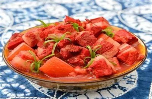 延年益壽別名紅曲肉:用三線肉加紅曲米經(jīng)特殊加工烹飪而成,食之添福加壽。其顏色不是化學(xué)色素染成,而是純天然食品紅曲米的功效,肉已通過煎煮脫脂,吃起來清香爽口。