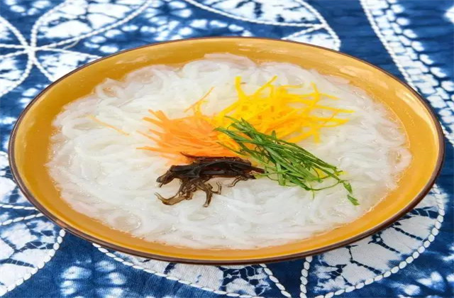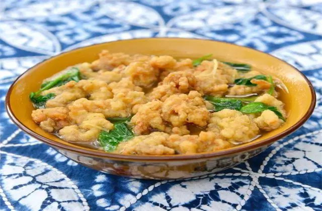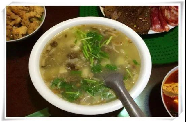 千里順風(fēng)湯別名蝦米湯:用涼粉丁﹑豆腐丁﹑蒜苗和炒米相煮而成?!八狻迸c“順”音相諧;蝦米為水中之物,順?biāo)问幭笳饕宦讽橈L(fēng)。這源于劍川木匠出門之故,家人遠走它鄉(xiāng),家里的妻子都要特意為他準(zhǔn)備一包劍湖魚蝦米,以備食用。煮吃時,其湯香香襲人,而且睹物思鄉(xiāng),以此寄托思親情結(jié),表示時刻不忘家中老小,象征千里順風(fēng),永戀家鄉(xiāng)。