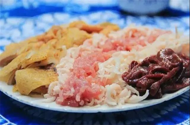 生皮是白族的一道傳統(tǒng)美食,每逢殺豬宴客,這道菜必不可多少??诟凶罴训氖堑静莼馃i,豬皮金黃,肉質(zhì)細(xì)嫩,再配上一碟秘制蘸水,滿口溢香。