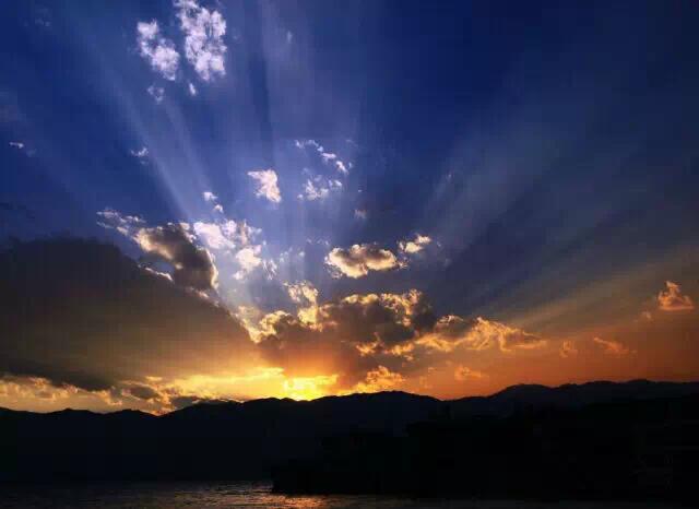 坐在太陽傘下,等日落。洱海這邊能經(jīng)??吹蕉∵_(dá)爾效應(yīng),就是俗稱的手電筒光??匆姽庵鶑脑茖哟蛳聛恚路鹩须p上帝之手在后面操控。大自然之美,不是不讓人敬畏的。