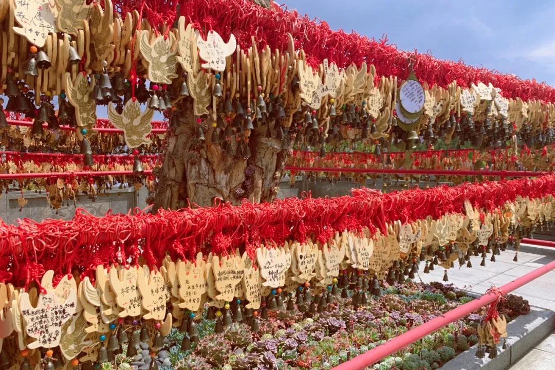 在大雄寶殿前,是許愿處,大家把心愿寫在木牌上,掛在殿前,風(fēng)吹的時候,叮當(dāng)作響,仿佛把大家的心愿傳達(dá)上天,希望菩薩保佑,心愿得償。