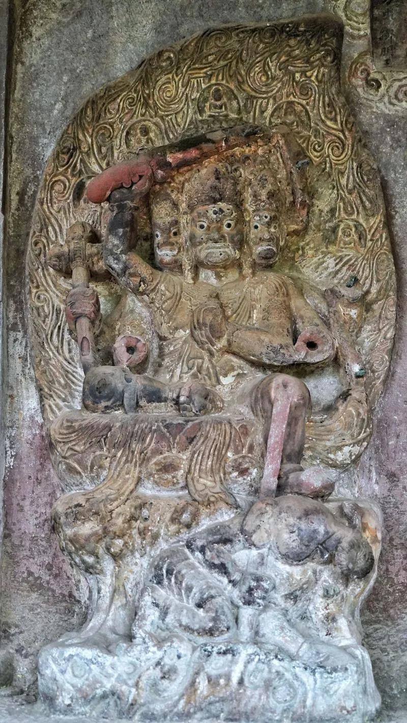六號窟的明王堂造像場面宏大,是石鐘山石窟中規(guī)模最大的一窟。而更為珍貴的是窟中在釋迦佛祖及弟子的兩側(cè)雕鑿了完整的八大明王的全身像。八大明王源于《大妙金剛經(jīng)》,是八大菩薩所化現(xiàn)的忿怒相。國內(nèi)以明王為題材的石雕造像,能與之相比的只有四川大足寶頂山石窟中的十大明王造像,而后者為半身像且年代較之更晚,因此可見石鐘山石窟中明王堂造像的珍貴程度以及在國內(nèi)造像藝術(shù)史上的地位。