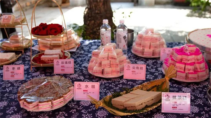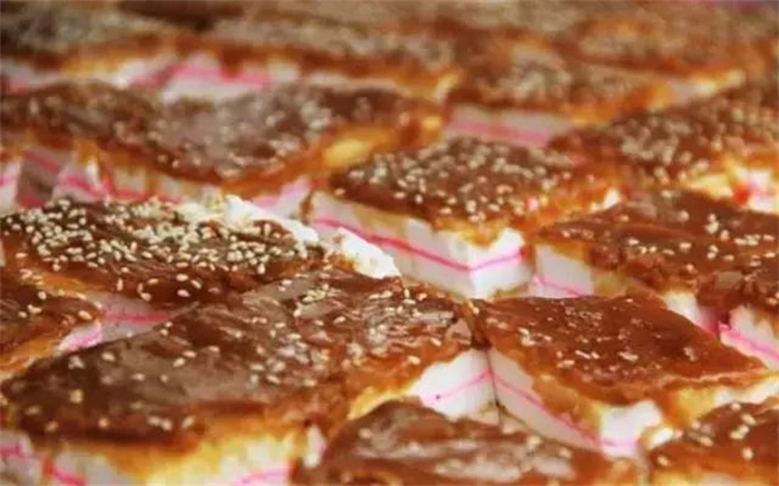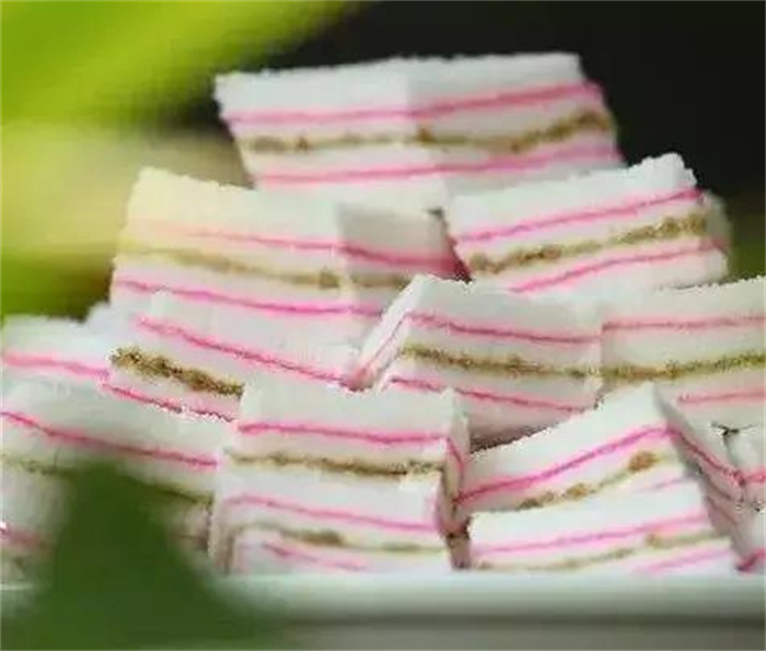 色糕呈正方形,中間有紅色腰線,表面為紅色罩面,紅白分明,質(zhì)細而美觀。