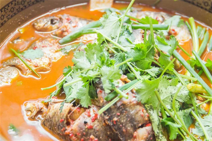 以洱海鯽魚為主材,大理酸辣魚搭配紅椒、青椒、木瓜、楊梅或?yàn)趺窞樵?,豆腐、土豆為輔料,用土灶燒柴火煮成。嘗上一口,鮮甜甘美,鮮香的魚湯用來泡飯也是一絕。