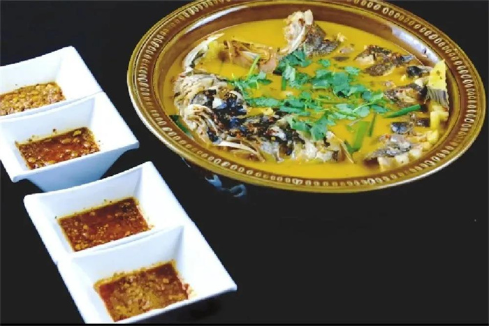 以酸精(檸檬精)、紅辣椒面、青蒜苗、草果粉、洋芋等為主要原料,海稍魚采用獨(dú)特的烹飪技藝加工而成。