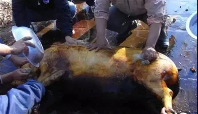 一頭豬被殺翻了,先用稻草點(diǎn)火,將其全身的皮子燒透,去毛,刮洗干凈。用稻草燒烤過(guò)后,整頭豬呈金黃色,皮子及其以下兩三寸的部位,實(shí)際上已經(jīng)被稻草烤熟了。然后開(kāi)肚解剖,趁新鮮將火燒豬肉的“不見(jiàn)天部分(肚底肉、后腿肉)”、豬嘴、豬肝分切成薄片或絲狀食用。